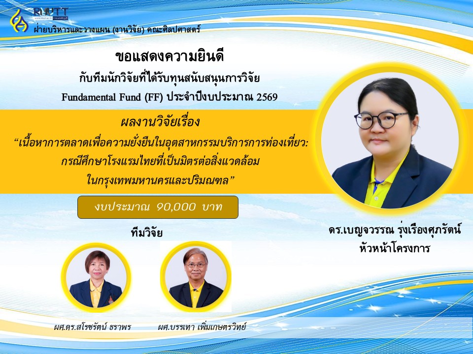 คณะศิลปศาสตร์ ขอแสดงความยินดี กับทีมนักวิจัยที่ได้รับทุนสนับสนุนการวิจัย Fundamental Fund (FF) ประจำปีงบประมาณ 2569ผลงานวิจัยเรื่อง “เนื้อหาการตลาดเพื่อความยั่งยืนในอุตสาหกรรมการบริการการท่องเที่ยว: กรณีศึกษาโรงแรมไทยที่เป็นมิตรต่อสิ่งแวดล้อมในกรุงเทพมหานครและปริมณฑล”