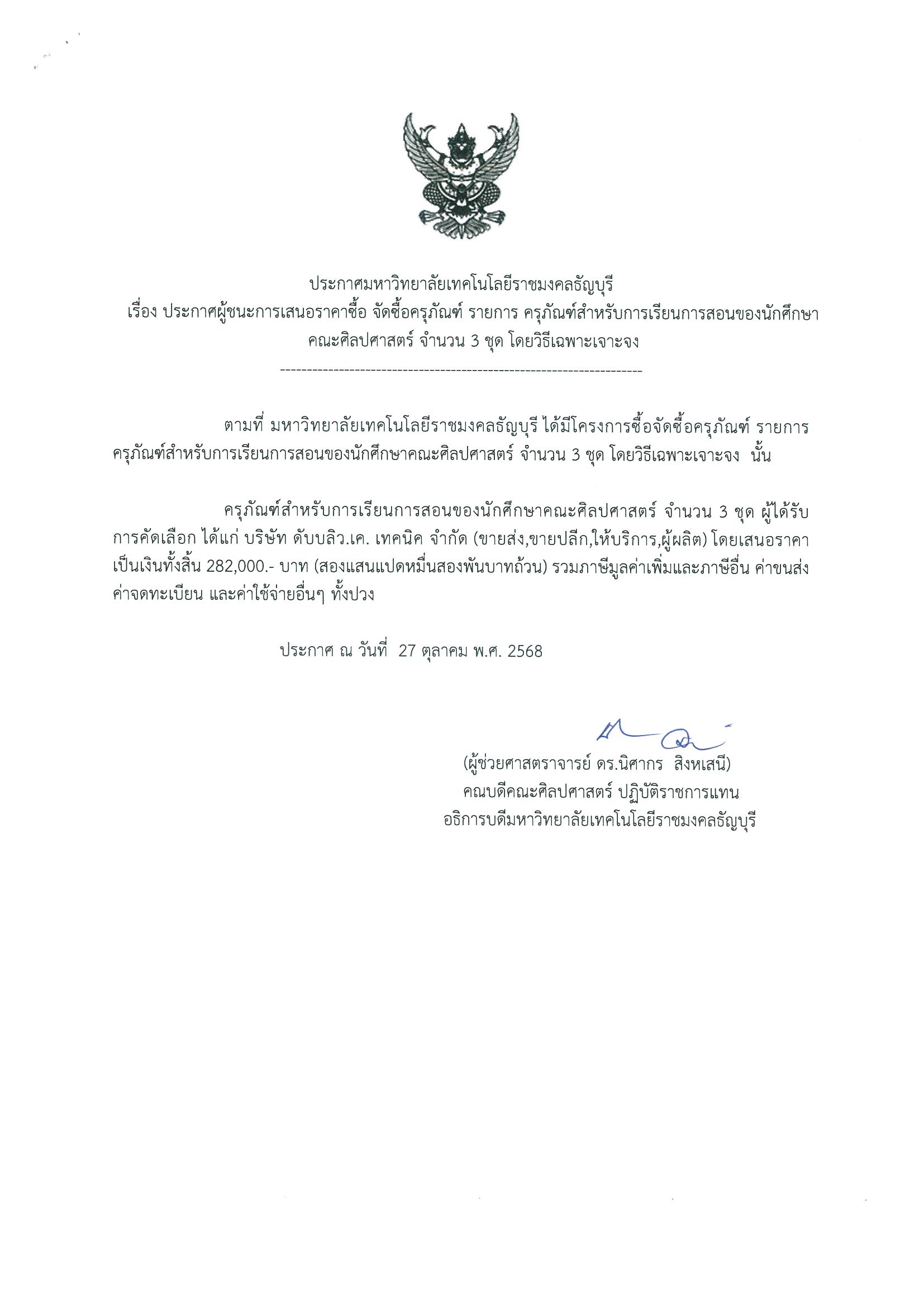 24 ตุลาคม 2025ประกาศราคากลางจัดซื้อครุภัณฑ์ รายการครุภัณฑ์สำหรับการเรียนการสอนของนักศึกษาคณะศิลปศาสตร์ จำนวน 3 ชุด ประกาศ ณ วันที่ 27 ตุลาคม 2568