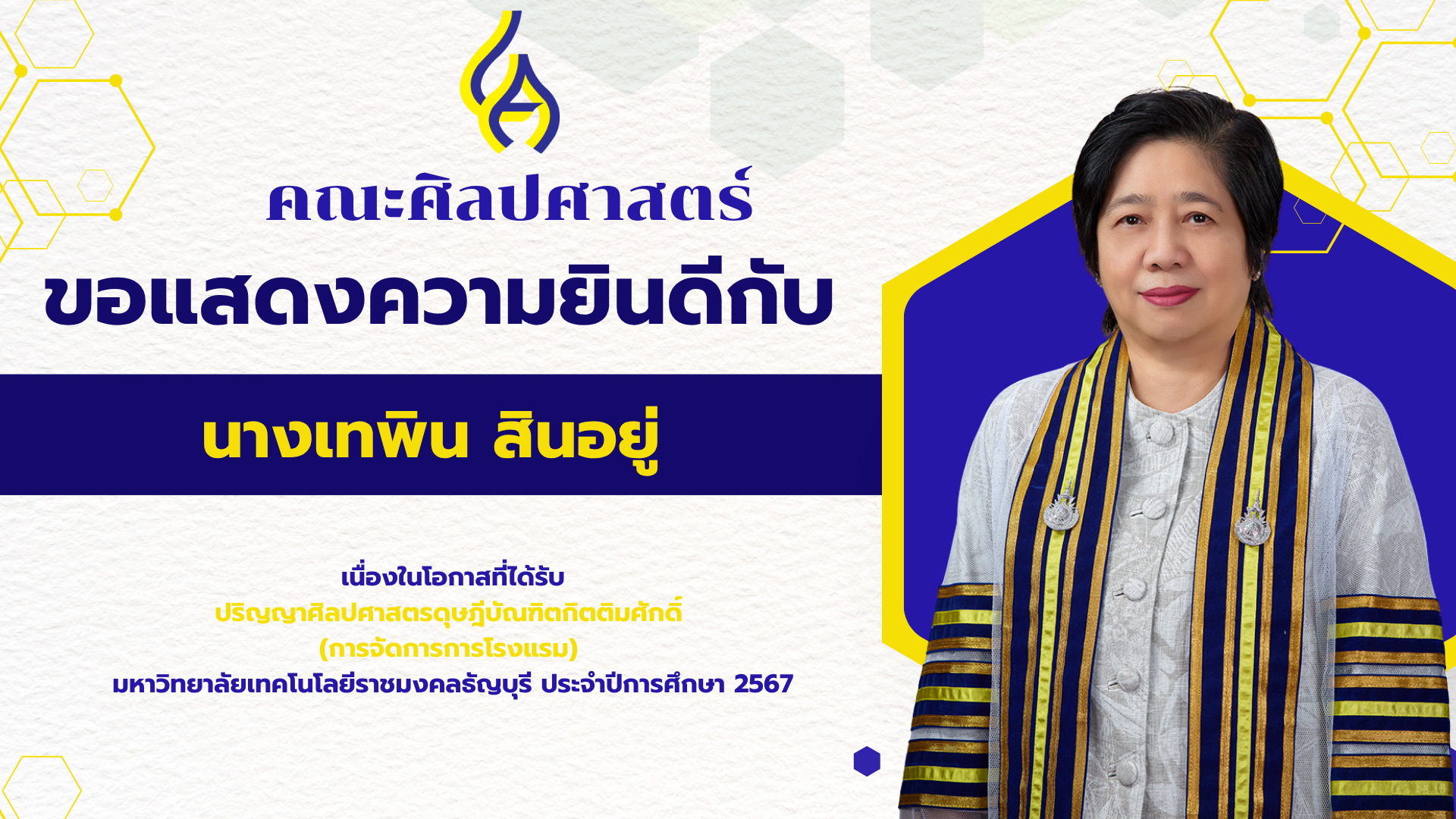 คณะศิลปศาสตร์ขอแสดงความยินดีกับนางเทพิน สินอยู่เนื่องในโอกาสที่ได้รับ ปริญญาศิลปศาสตรดุษฎีบัณฑิตกิตติมศักดิ์ (การจัดการการโรงแรม) มหาวิทยาลัยเทคโนโลยีราชมงคลธัญบุรี ประจำปีการศึกษา 2567