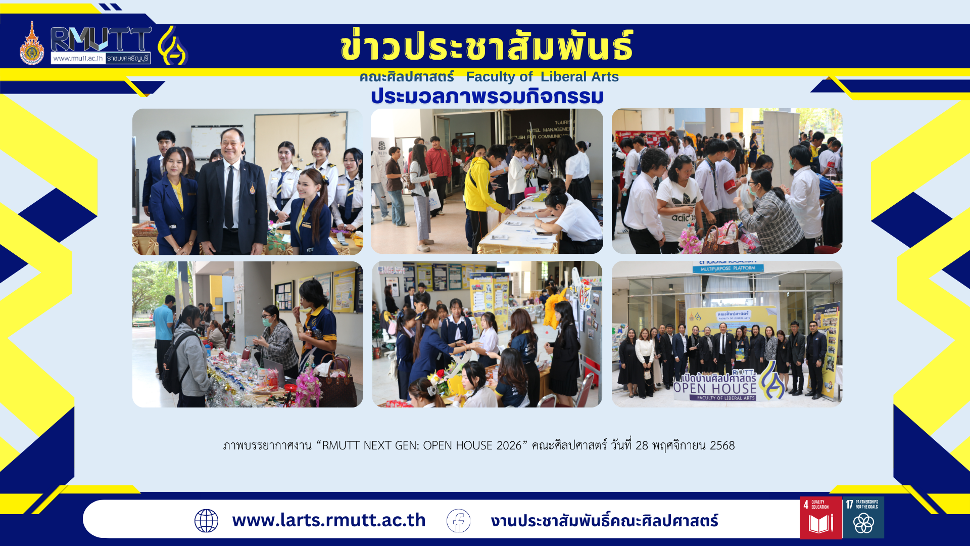 25 พฤศจิกายน 2025RMUTT open house 2026 และเปิดบ้าน ศิลปศาสตร์ 2569 วันที่ 27 ถึง 28 พฤศจิกายน 2568 ตั้งแต่เวลา 08:30 น. จนถึง 16:00 น. ณ ลานอเนกประสงค์ คณะศิลปศาสตร์