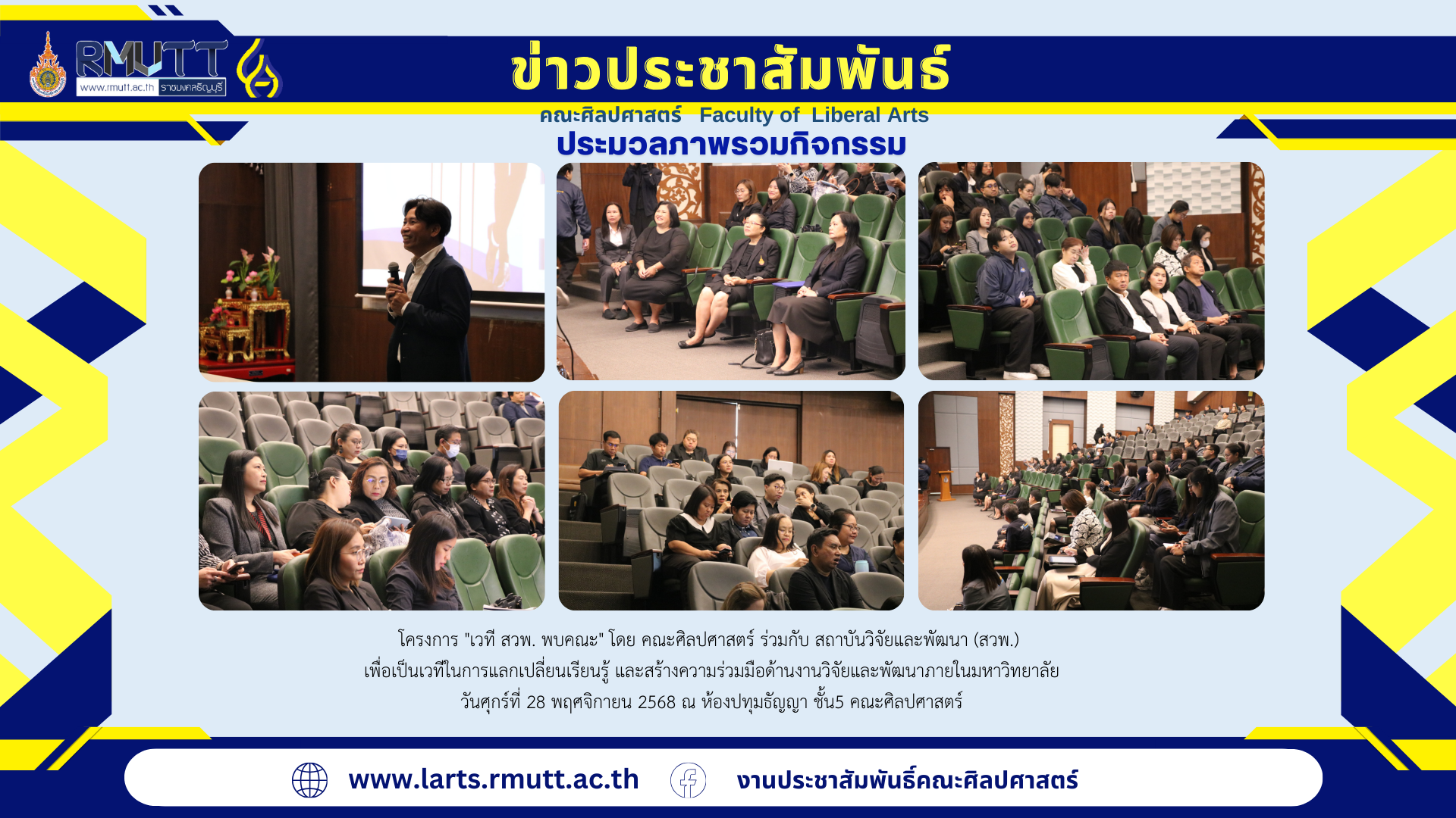 28 พฤศจิกายน 2025โครงการ “เวที สวพ. พบคณะ” โดย คณะศิลปศาสตร์ ร่วมกับ สถาบันวิจัยและพัฒนา (สวพ.) เพื่อเป็นเวทีในการแลกเปลี่ยนเรียนรู้ และสร้างความร่วมมือด้านงานวิจัย