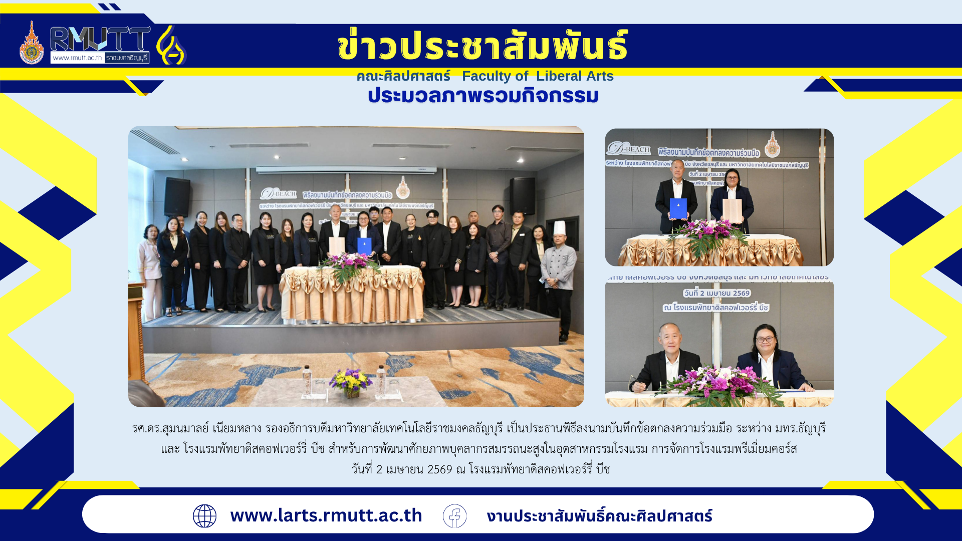 3 เมษายน 2026พิธีลงนามบันทึกข้อตกลงความร่วมมือ ระหว่าง มทร.ธัญบุรี และ โรงแรมพัทยาดิสคอฟเวอร์รี่ บีช สำหรับการพัฒนาศักยภาพบุคลากรสมรรถนะสูงในอุตสาหกรรมโรงแรม