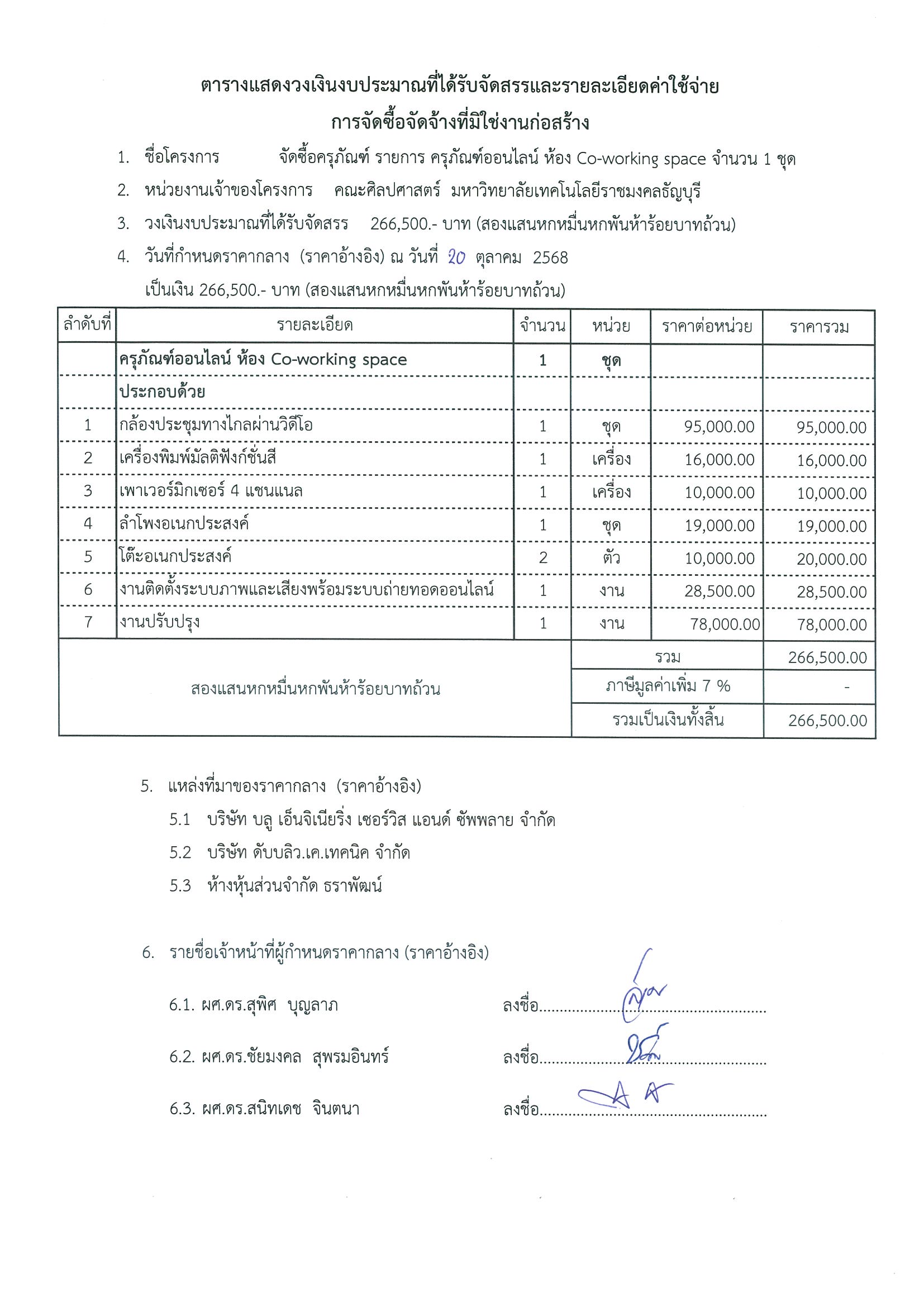 ประกาศผู้ชนะเสนอราคาซื้อครุภัณฑ์รายการ ครุภัณฑ์ออนไลน์ห้อง Co-working space จำนวน 1 ชุด วิธีเฉพาะเจาะจง คณะศิลปศาสตร์ ประกาศ ณ วันที่ 20 ตุลาคม 2568