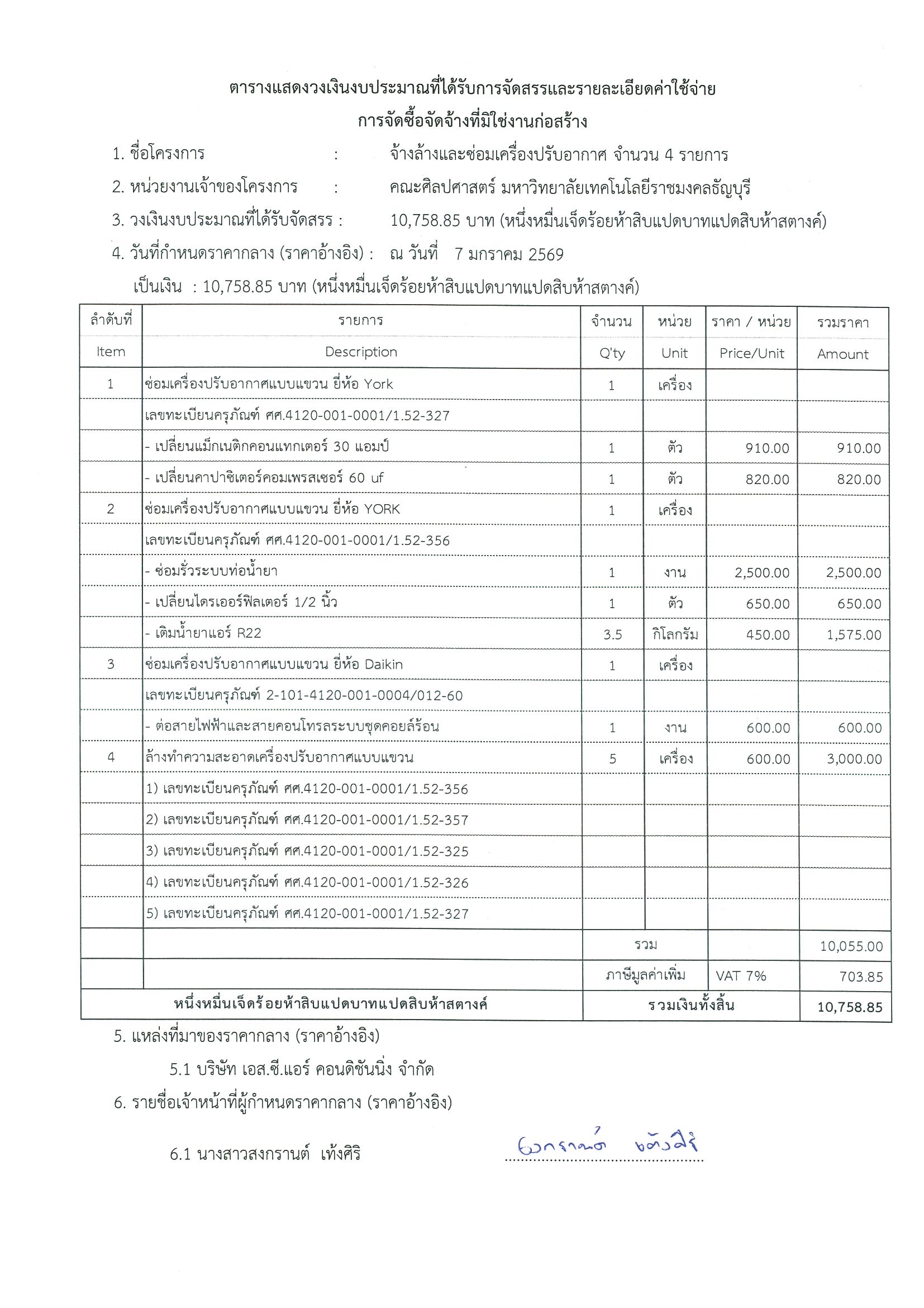 ประกาศผู้ชนะการเสนอราคาจ้างล้างและซ่อมเครื่องปรับอากาศ จำนวน 4 รายการ โดยวิธีเฉพาะเจาะจง ประกาศ ณ วันที่ 7 มกราคม 2569
