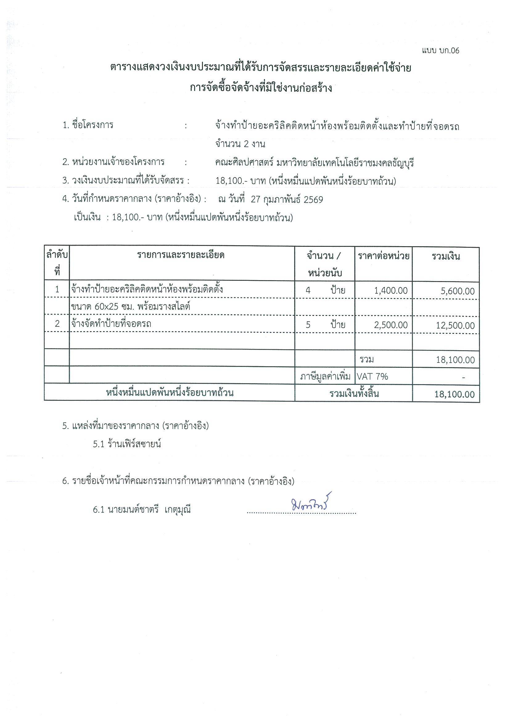 ประกาศผู้ชนะการเสนอราคาจ้างทำป้ายอะคริลิคติดหน้าห้องพร้อมติดตั้งและทำป้ายที่จอดรถ จำนวน 2 งาน คณะศิลปศาสตร์ ประกาศ ณ วันที่ 27 กุมภาพันธ์ 256927 February 2026”โครงการพัฒนาแนวคิดเชิงระบบสู่ความเป็นเลิศคณะศิลปศาสตร์“ณ โรงแรมเซ็นทาราอยุธยาจังหวัดพระนครศรีอยุธยาวันที่ 28 กุมภาพันธ์ ถึง 1 มีนาคม 25691 March 2026 ประกาศราคากลางจ้างทำป้ายอะคริลิคติดหน้าห้องพร้อมติดตั้่งและทำป้ายที่จอดรถ จำนวน 2 งาน คณะศิลปศาสตร์ ประกาศ ณ วันที่ 27 กุมภาพันธ์ 2569 Share0 สุจิตรา Related posts23 February 2026ประกาศราคากลางจ้างซ่อมแซมระบบกล้องวงจรปิดลานจอดรถและบริเวณรอบอาคาร 9 ชั้น จำนวน 3 รายการ คณะศิลปศาสตร์ ประกาศ ณ วันที่ 23 กุมภาพันธ์ 2569Read more Comments are closed.