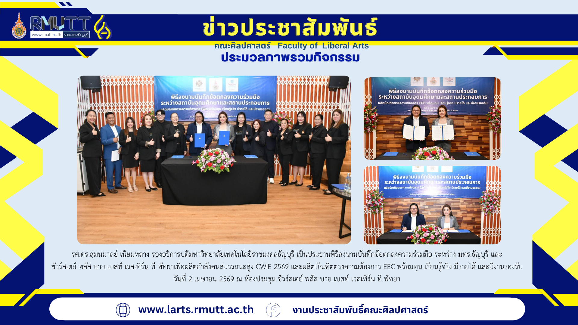 พิธีลงนามบันทึกข้อตกลงความร่วมมือ ระหว่าง มทร.ธัญบุรี และ ชัวร์สเตย์ พลัส บาย เบสท์ เวสเทิร์น ที พัทยาเพื่อผลิตกำลังคนสมรรถนะสูง CWIE 2569 และผลิตบัณฑิตตรงความต้องการ EEC